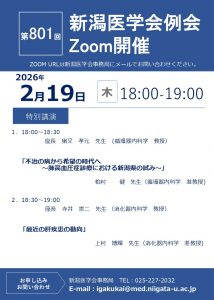 2026年2月19日(木) 18時から新潟医学会例会をZoomによるオンライン開催いたしますので、是非ご参加ください。URLにつきましては、新潟医学会事務局にお尋ねください。 R8.2月新潟...
